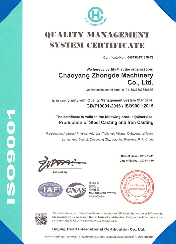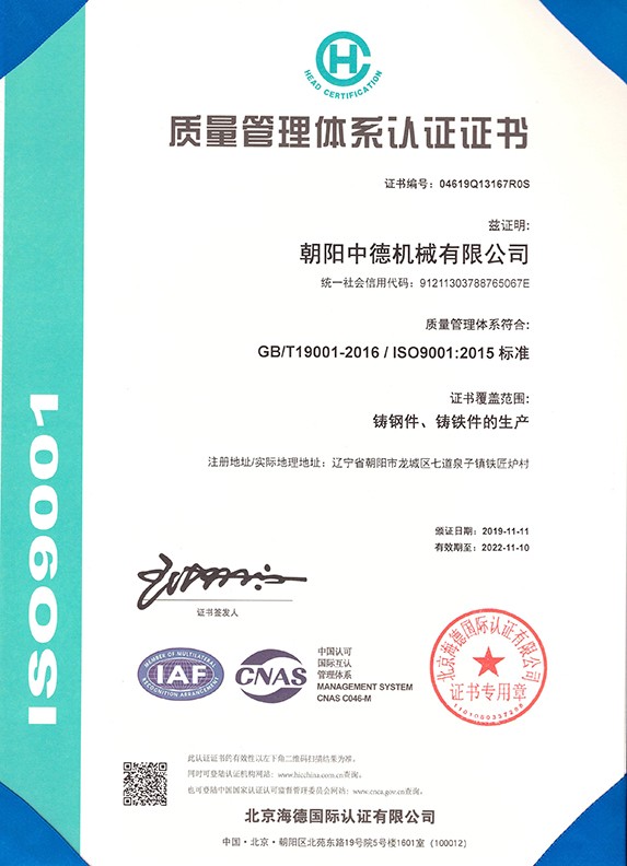朝陽中德機(jī)械有限公司座落于有著“東方佛都”之稱的三燕古都,歷史文化名城——朝陽,具體位置朝陽市龍城區(qū)七道泉子鎮(zhèn)鐵匠爐村。公司創(chuàng)建于2006年5月是一家以鑄鋼件、鑄鐵件,集按用途設(shè)計、開發(fā)、生產(chǎn)、銷售于一體的,為機(jī)械設(shè)備配套的生產(chǎn)型公司。公司注冊資金1000萬,固定資產(chǎn)投資1480萬元,主要生產(chǎn)設(shè)備GGW-5T,GGW-10T,GGW-10T中頻感應(yīng)爐;GDY-13C高溫電阻窯、GDY-9.5C電阻窯,M4000型直讀光譜儀,DP-3985型硬度測試儀,倒置式金相顯微鏡、拉伸試驗(yàn)機(jī)、超生波探傷儀,檢測手段完備。